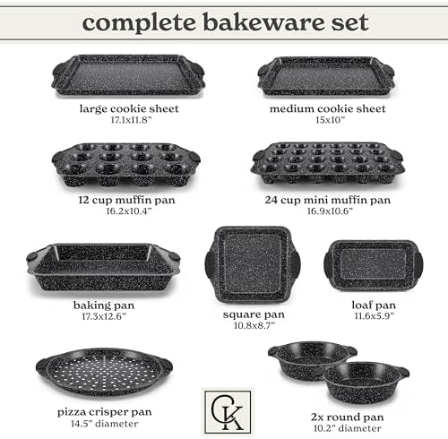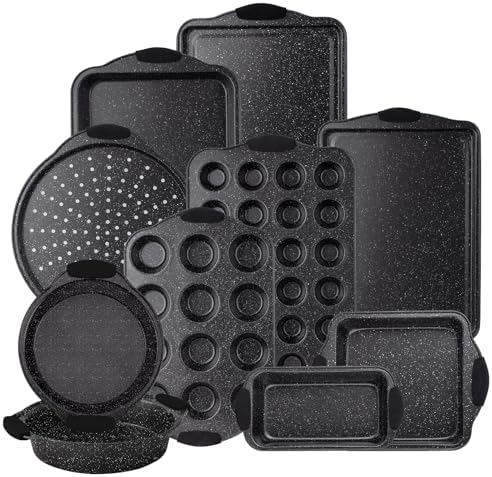 10 Piece Baking Set: This space saving beginner baking set includes a variety of pans, great for all your baking needs. It includes a non stick cookie sheet, a large and small baking pan, and more.